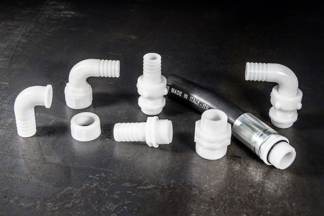 The PA (polyamide) 66 fittings of our Linea 2000 are the real alternative to the use of metal. All users who decided to replace metal fittings with others in technopolymers are fully satisfied. They are using them for jointing apllications , for connecting pipes to pumps for rainwater, sewage, foul waste water, water containing mud or sand.